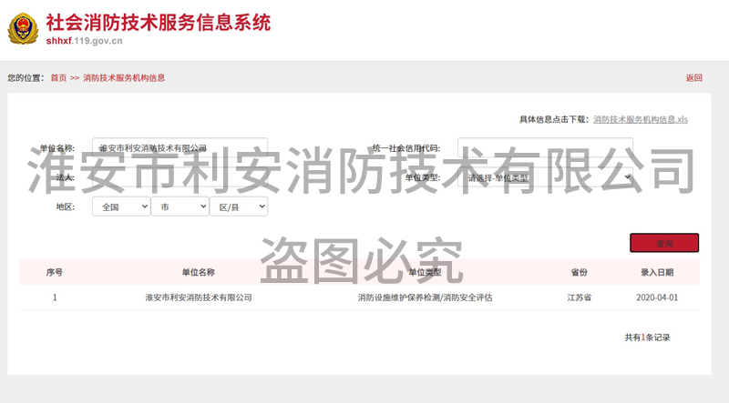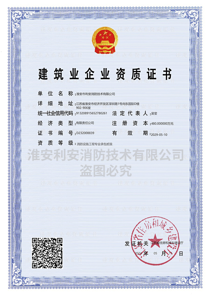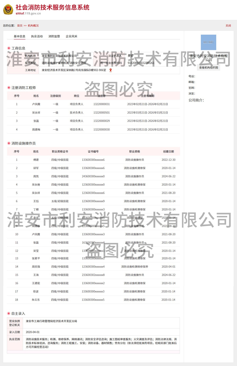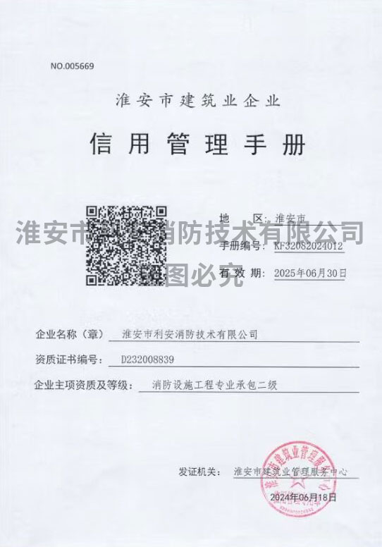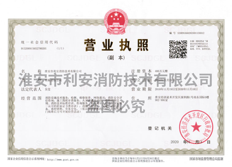淮安市利安消防技術(shù)有限公司成立于二0一0年,目前滿(mǎn)足2019年8月29日,應(yīng)急管理部頒布《消防技術(shù)服務(wù)機(jī)構(gòu)從業(yè)條件》,已在江蘇消防網(wǎng)注冊(cè)備案,可以從事消防設(shè)施的檢測(cè)、維修保養(yǎng)、消防評(píng)估,且取得江蘇省建委頒發(fā)的消防設(shè)施工程專(zhuān)業(yè)承包貳級(jí)資質(zhì)證書(shū),可從事消防設(shè)施安裝。