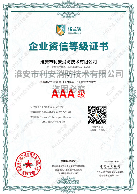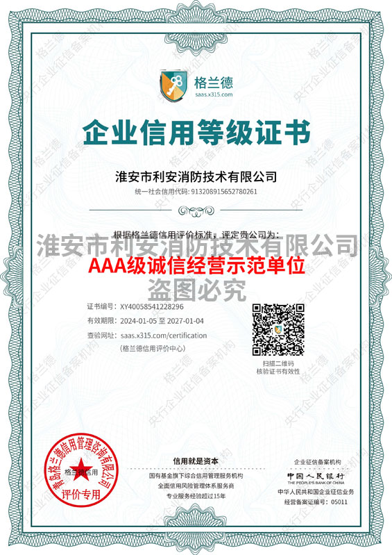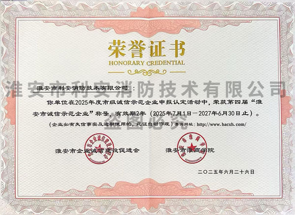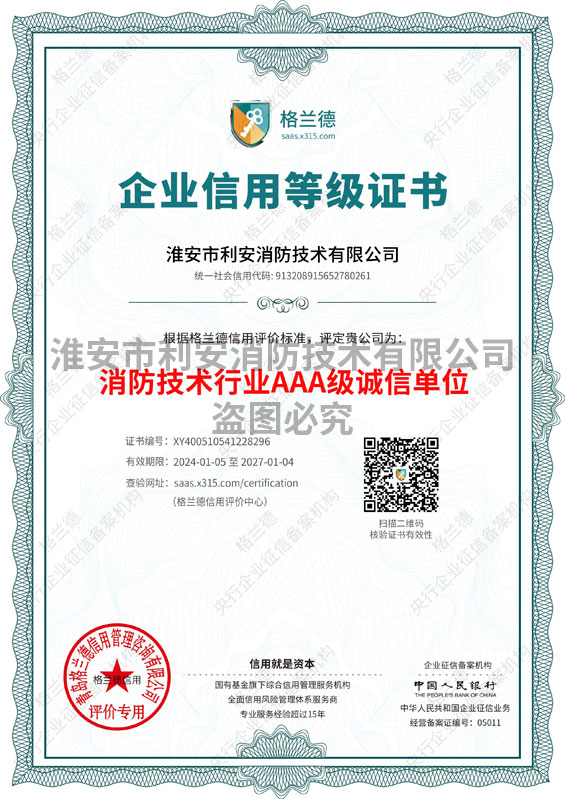熱烈祝賀淮安市利安消防技術(shù)有限公司榮獲“淮安市第二屆誠(chéng)信示范... [2020-8-6]