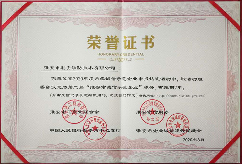 熱烈祝賀淮安市利安消防技術(shù)有限公司榮獲“淮安市第二屆誠(chéng)信示范企業(yè)“認(rèn)定